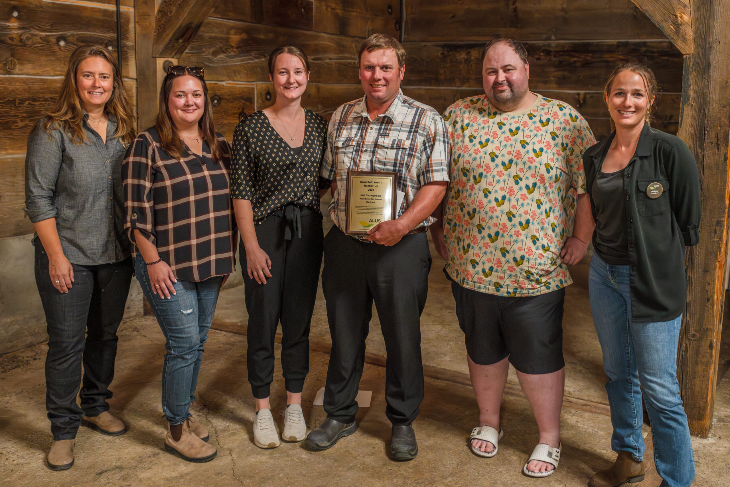 Neil Claringbould receiving his award at the ALUS West Hub Field Conference, along with the ALUS Seine Rat Roseau Program Coordinators, Joey Pankiw & Dani Gosselin, ALUS CEO Jordan Sinclair, and ALUS Hub Mangers Nicole Baldwin & Paige Englot.