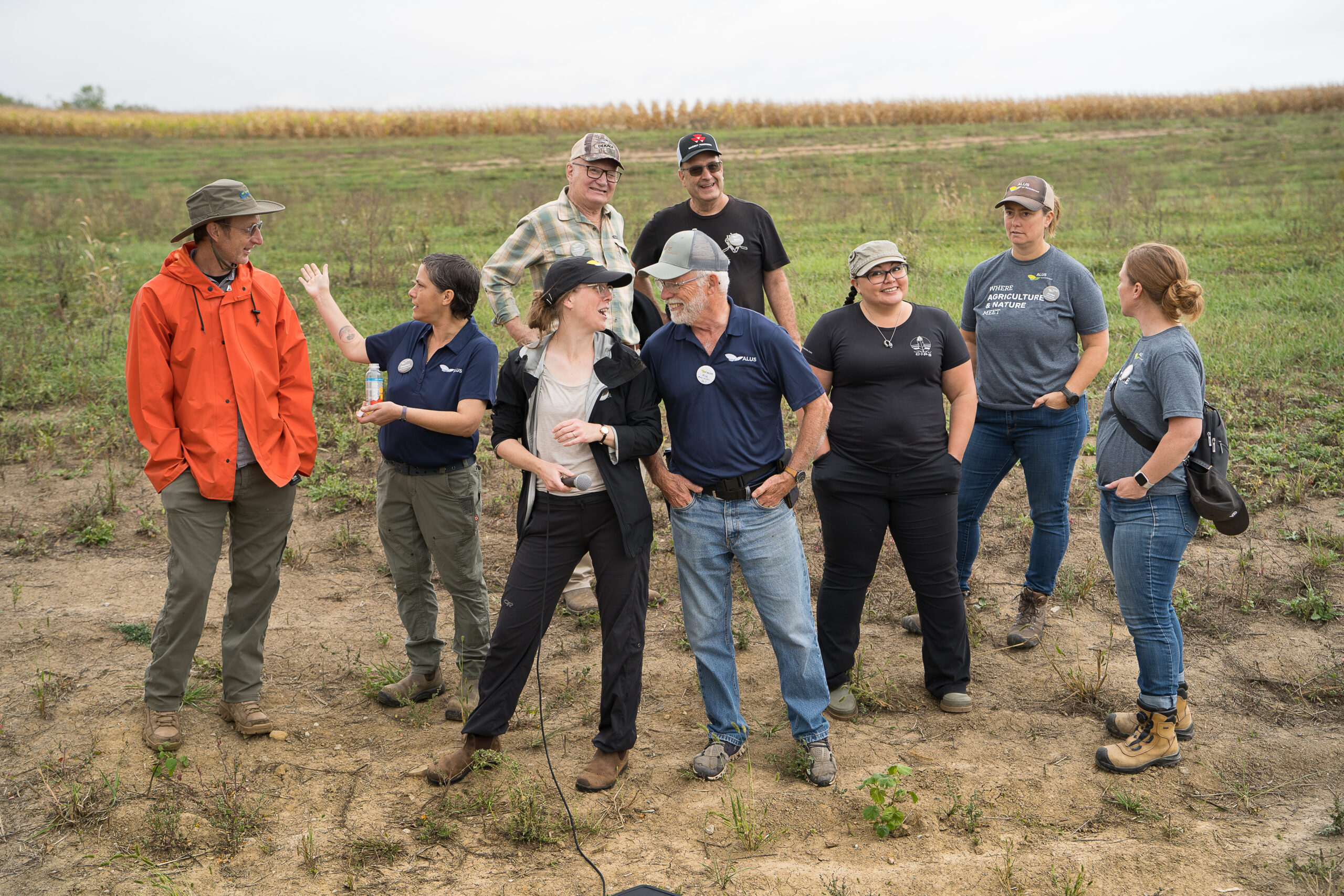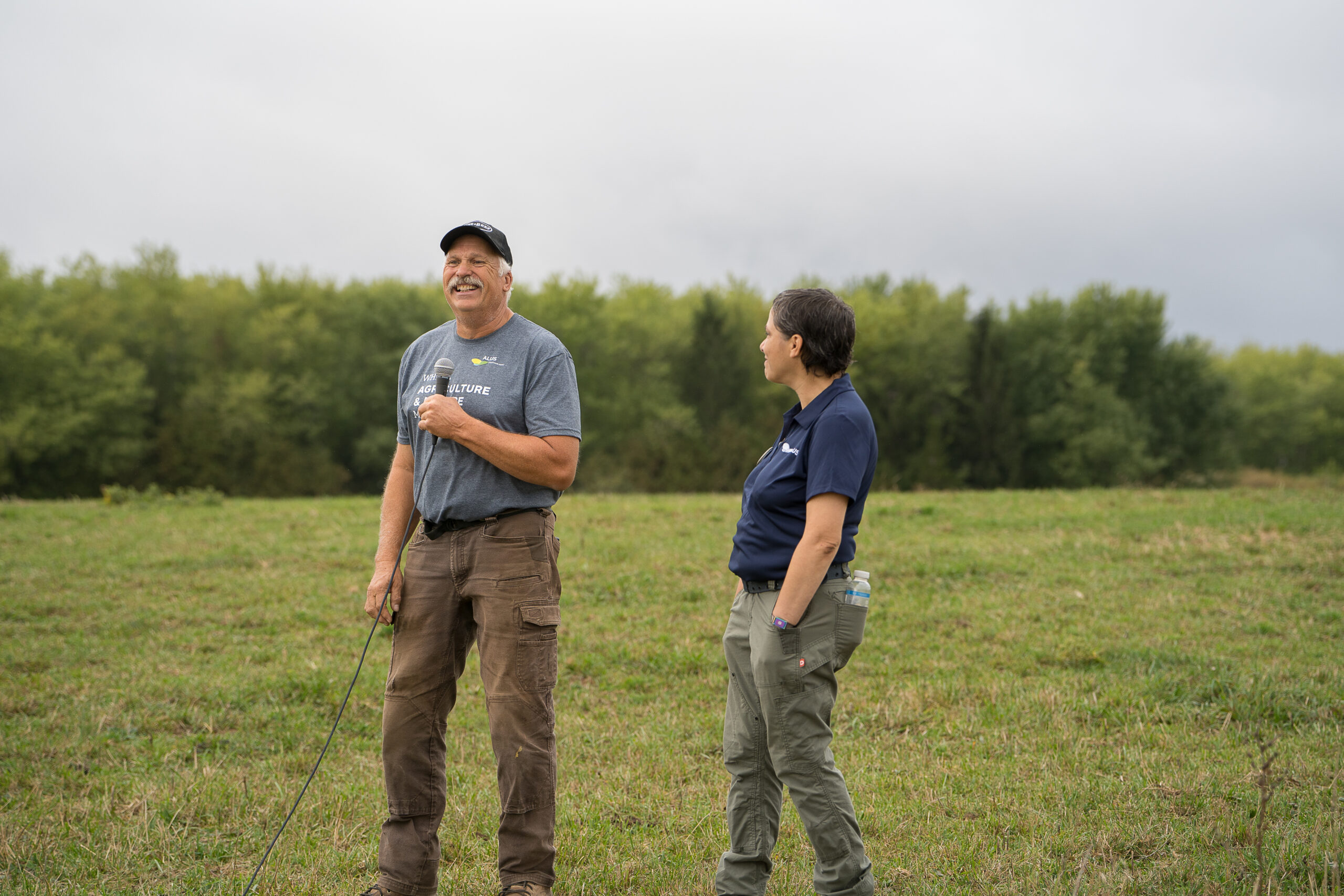 Bob and Moira Kerr, Wolfe Creek Organic Farms, speaking about the Kerr-Wilson Renaturalization Project, along with Rashel Tremblay, ALUS Chatham-Kent Coordinator. >> Jordan Sinclair, CEO ALUS passes the mic >> East Hub Participants walk along the Kerr-Wilson Renaturalization Project.